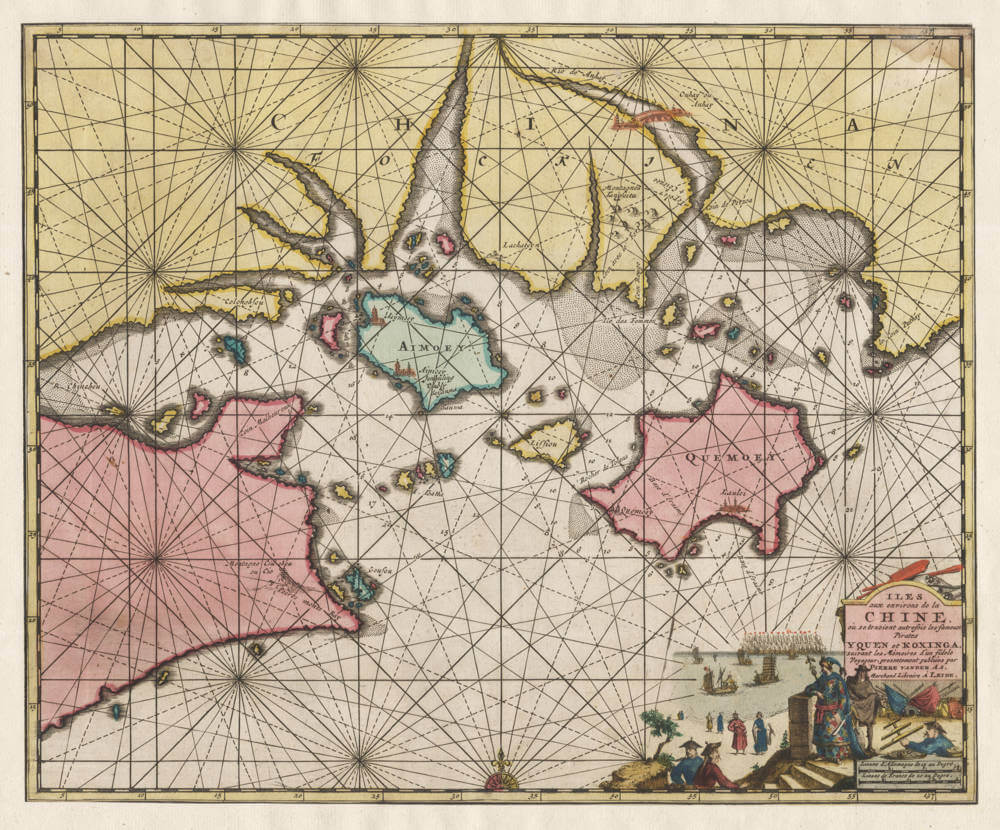 Exceptionally rare sea chart of the waters around Amoy and Quemoy, issued in 1714 in Leiden by Pieter van der Aa. The map is of medium size and is famous for its decorative and spectacular title cartouche and improved geography of the area.