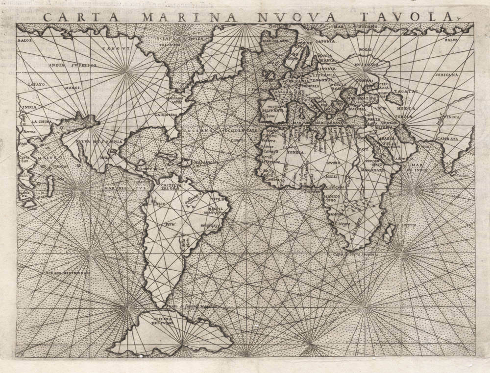 "There are two 'modern' world maps in Ruscelli's edition of Ptolemy's Geographia: a double-hemisphere map and a rectangular 'Carta Marina'. Both follow earlier maps - oval and rectangular - which had appeared in Gastaldi's Ptolemaic atlas of 1548."