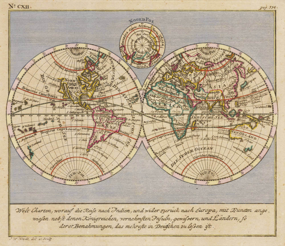 The double hemisphere map of the world, from Wolfgang Heydt's show case book about the VOC, Allerneuester Geographisch- und Topographischer Schau-Platz von Africa und Ost-Indien oder Ausführliche und Wahrhafte Vorstellung und Beschreibung von den Wichtigsten der Holländisch-Ost-Indischen Compagnie in Africa und Asia zugehörigen Ländere, Küsten und Insulten in accuraten See- und Land-Karten.