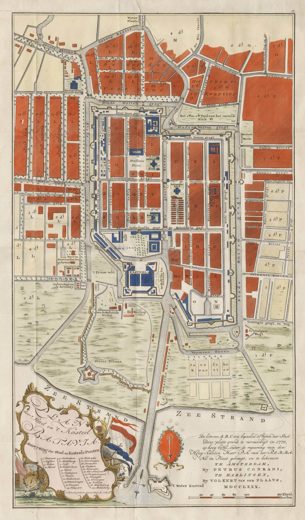 Cartographically, Conrad's plan draws on earlier surveys, possibly incorporating data from VOC engineers and updated observations up to the 1770s. It documents the city's expansion beyond the original walls, with suburbs (vorsteden) extending westward along the river, including the affluent Tanah Abang and Glodok areas. Fortifications are shown in detail, with demi-lunes, covered ways, and glacis, indicative of Vauban-inspired trace italienne designs adapted for insular defense against regional rivals like the Mataram Sultanate and British interlopers.