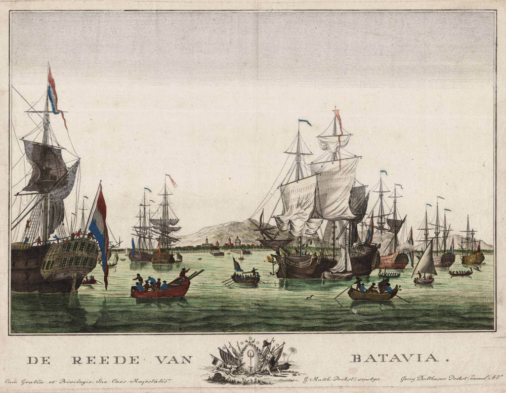 This finely executed copperplate engraving captures the bustling roadstead of Batavia, the principal Dutch East India Company (VOC) settlement in Southeast Asia, as it appeared in the mid-eighteenth century. Batavia, established in 1619 on the northwestern coast of Java, served as the administrative and commercial hub of the VOC's vast trading network across the Indian Ocean and beyond. The title, 'De Reede van Batavia' ('The Roads of Batavia') reflects the anchorage's role as a vital maritime crossroads where East Indiamen, fluyts, and smaller craft converged to load spices, textiles, porcelain, and other commodities before embarking on the perilous return voyage to Europe via the Cape of Good Hope.